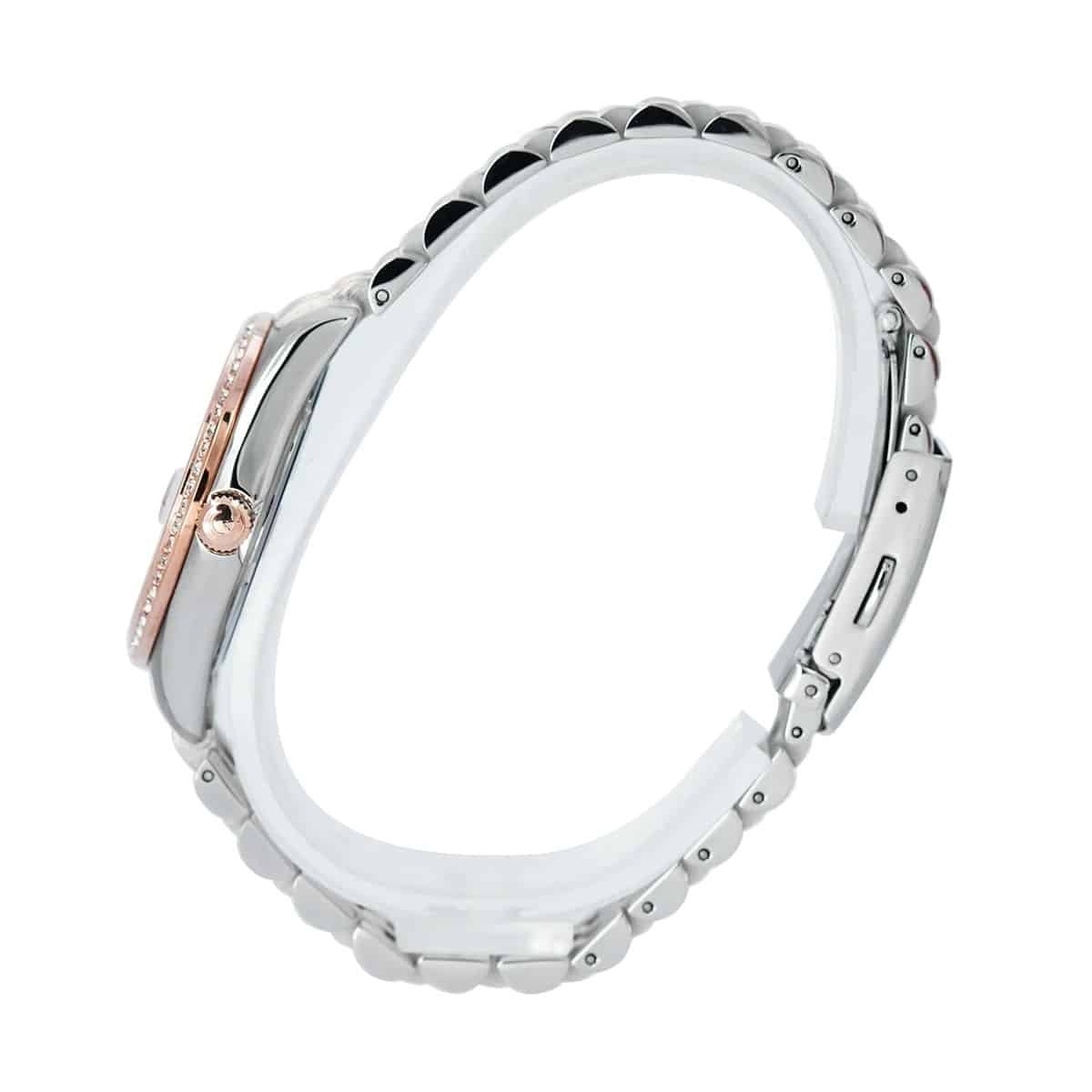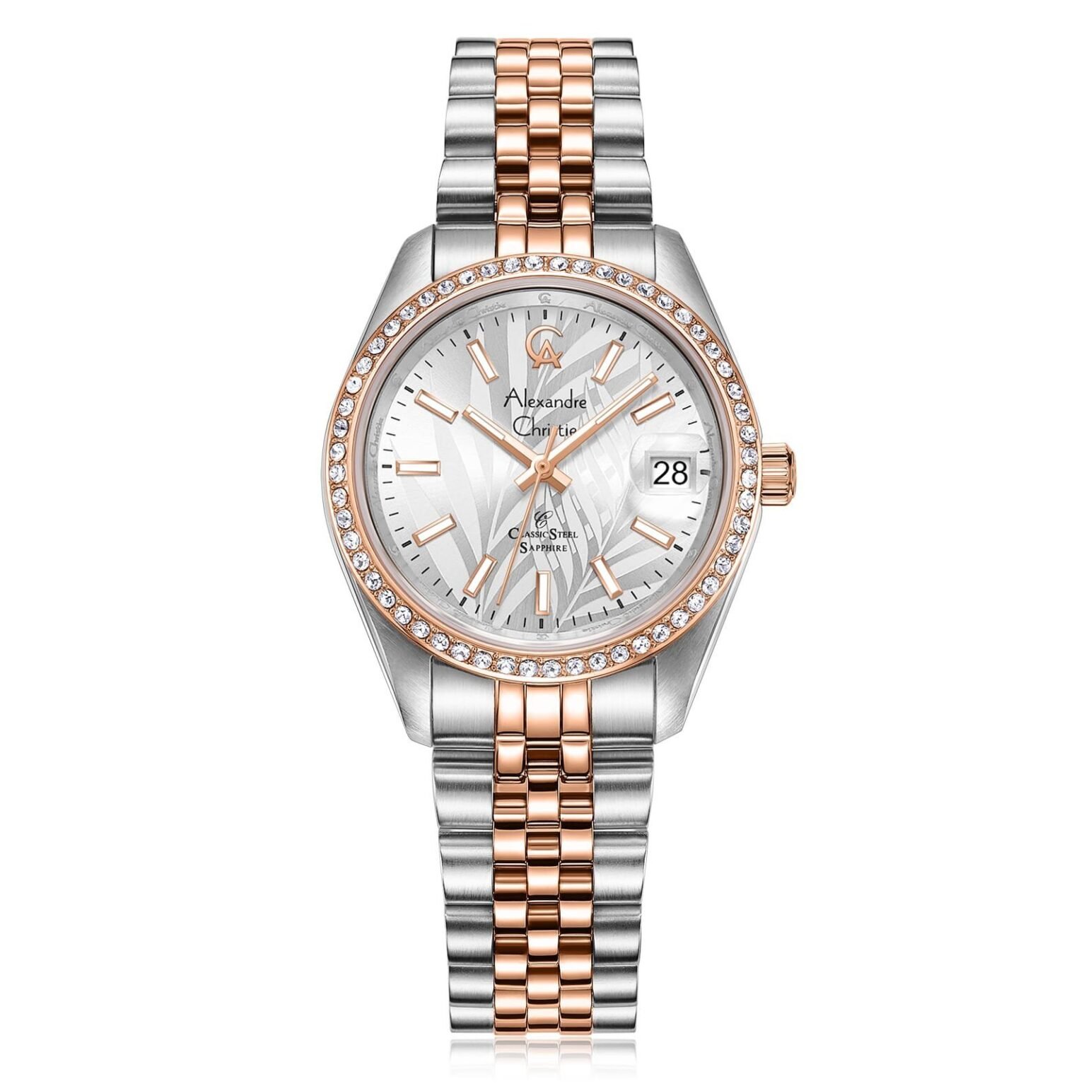 Lending a contemporary twist to an elegant design, this women’s analog watch from Alexandre Christie is a must-have wrist essential. Its strap comes in a two-toned shade that elevates the look of the watch. The silver round dial is secured by a sapphire crystal and is housed in a case with a crystal embellished bezel. It exudes plain 3-hand, and a crown for time adjustment. Furthermore, it is completed with a deployment clasp to ensure a secure fit on the wrist.