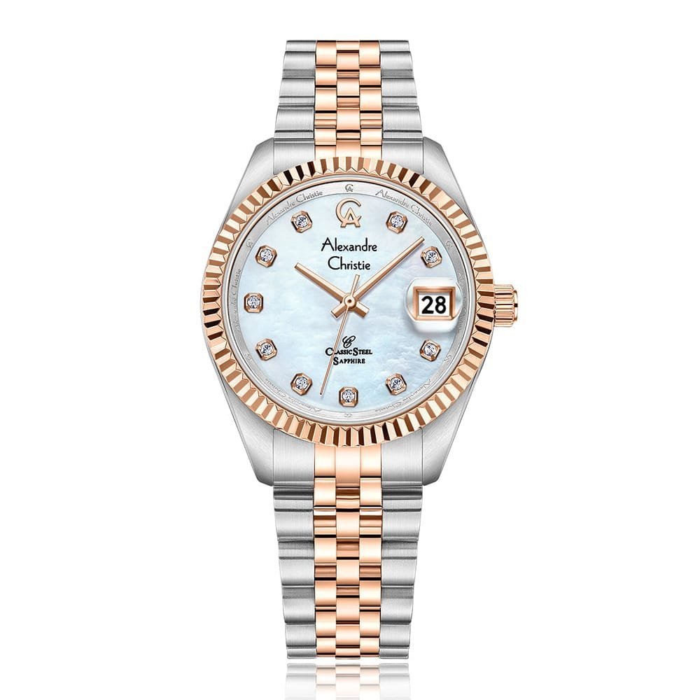 Lending a contemporary twist to an elegant design, this women’s analog watch from Alexandre Christie is a must-have wrist essential. Its strap comes in a shade of rose gold that elevates the look of the watch. The rose gold round dial is secured by a sapphire crystal and is housed in a stainless steel case. It exudes plain 3-hand, and a crown for time adjustment. Furthermore, it is completed with a deployment clasp to ensure a secure fit on the wrist.
