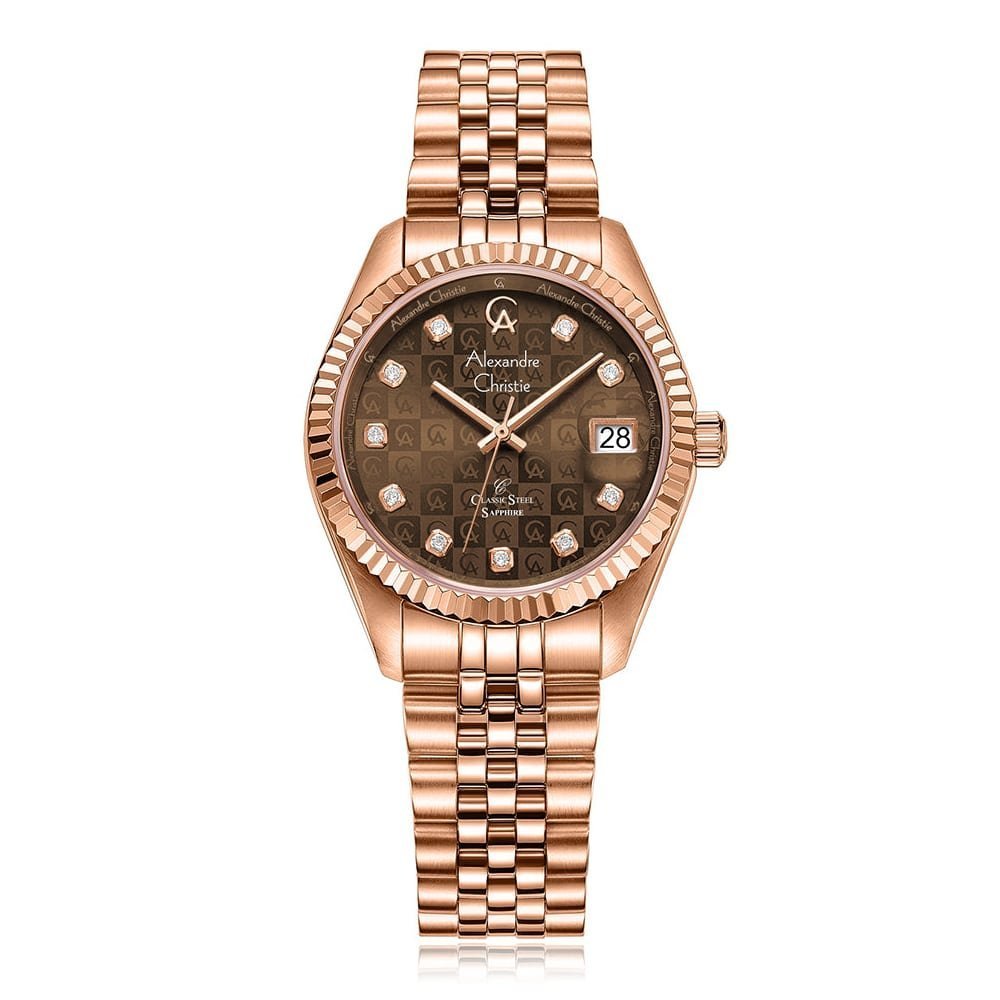 Lending a contemporary twist to an elegant design, this women’s analog watch from Alexandre Christie is a must-have wrist essential. Its strap comes in a shade of rose gold that elevates the look of the watch. The rose gold round dial is secured by a sapphire crystal and is housed in a case with a crystal embellished bezel. It exudes plain 3-hand, and a crown for time adjustment. Furthermore, it is completed with a deployment clasp to ensure a secure fit on the wrist.