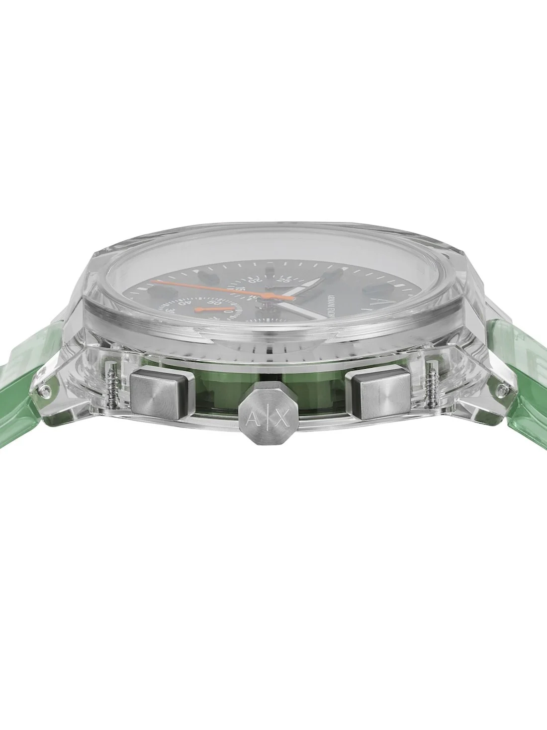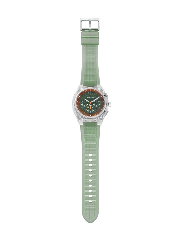 Chronograph sophistication meets modern style with Armani Exchange’s 44mm watch. Featuring a striking Green glossy dial and a matching Green strap, this timepiece boasts a precise quartz movement and durable mineral crystal. The round case and sleek design make it a standout accessory for any occasion. Elevate your wristwear with this impeccably crafted Armani Exchange watch.