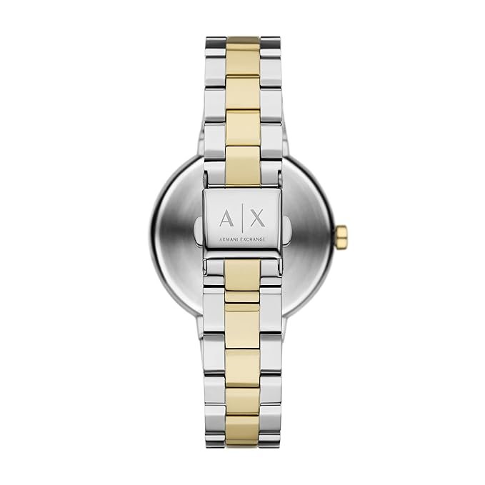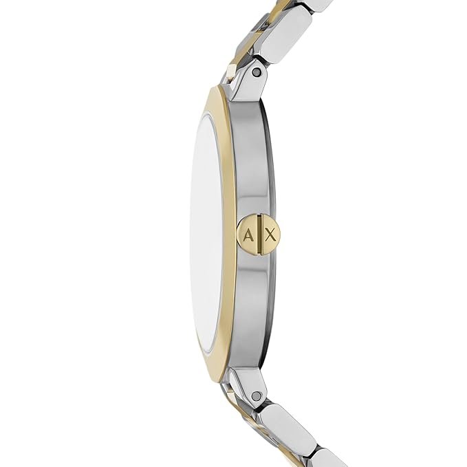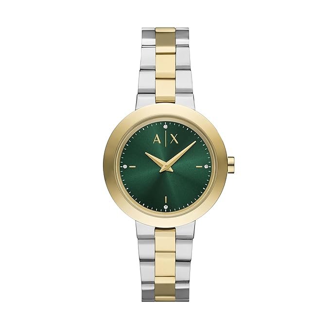 Armani Exchange’s 36mm two-tone stainless steel watch features a captivating green sunray dial and elegant two-hand quartz movement. The combination of rose gold and silver tones on the bracelet adds a touch of sophistication, making this timepiece a versatile accessory for any occasion. The mineral crystal ensures durability, while the classic round case shape exudes timeless style.