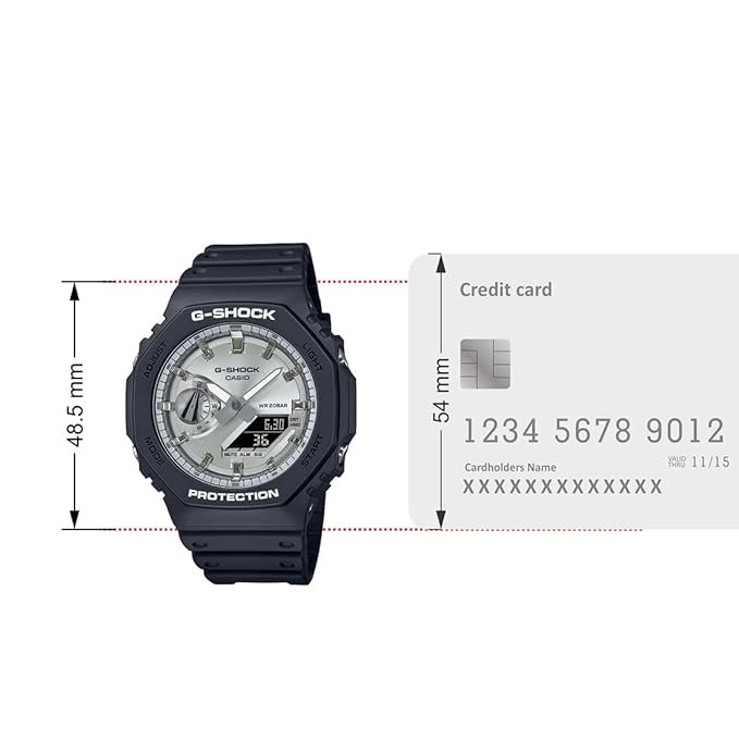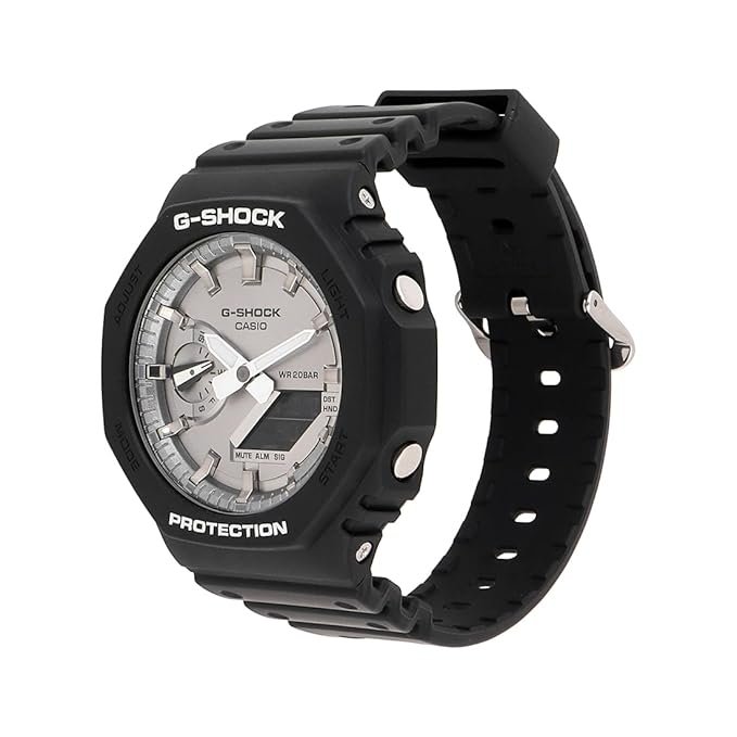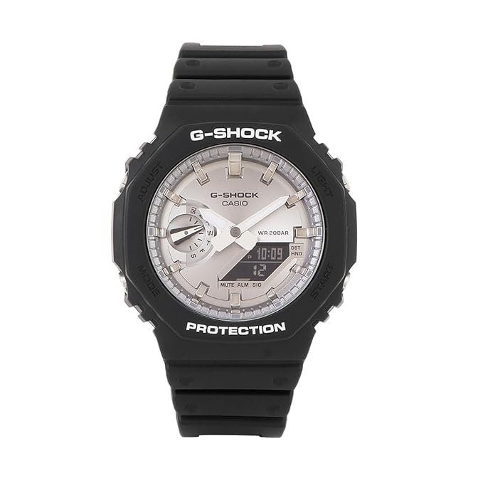 Go metal-clad in cool, sophisticated color with a slim GA-2100 that inherits the design concept of the first-ever G-SHOCK. The polished gleam of metallic color and the iconic octagonal form of the DW-5000C, the original G-SHOCK, come together in a rugged digital analog combination timepiece measuring just 11.8mm from bezel to case back. A slim design with the same tough G-SHOCK construction. Finished beautifully with a circular hairline treatment, the dial is also treated with gold-color vapor deposition, as are the index marks. Add a bezel and band in glossy black for a timepiece that makes a bold and elegant statement.