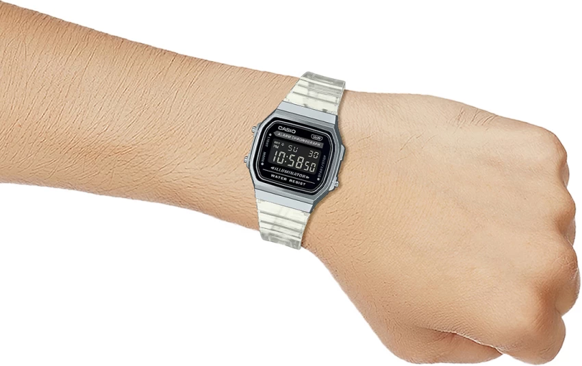 Tap into 80s nostalgia with this digital watch from the Vintage collection by Casio. The black rectangular-shaped dial features multifunctionality. The watch works on a quartz movement. The resin strap comes in a white hue that further elevates the look of the watch. Besides, it is completed with a buckle clasp to ensure a secure fit on the wrist. It is a highly fashionable watch and a stylish go-to accessory. It boasts not just excellent design, but comes equipped with functions helpful for everyday life, such as an EL backlight, stopwatch, alarm and battery life of about seven years.