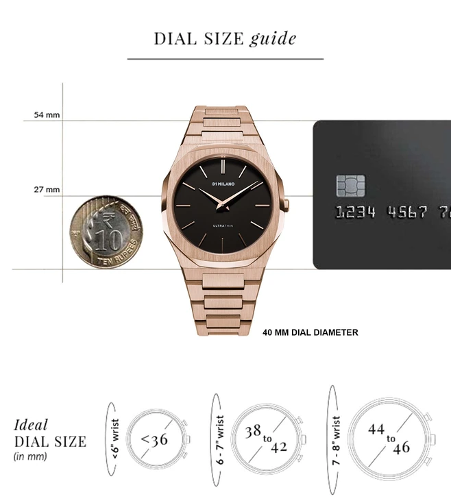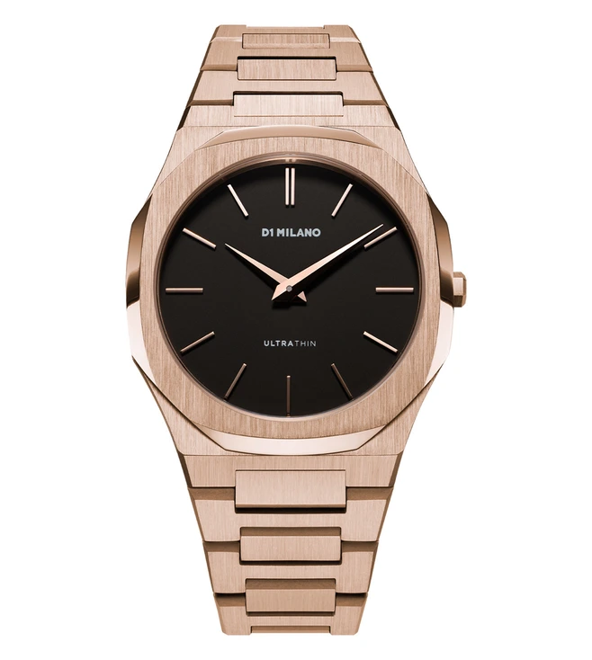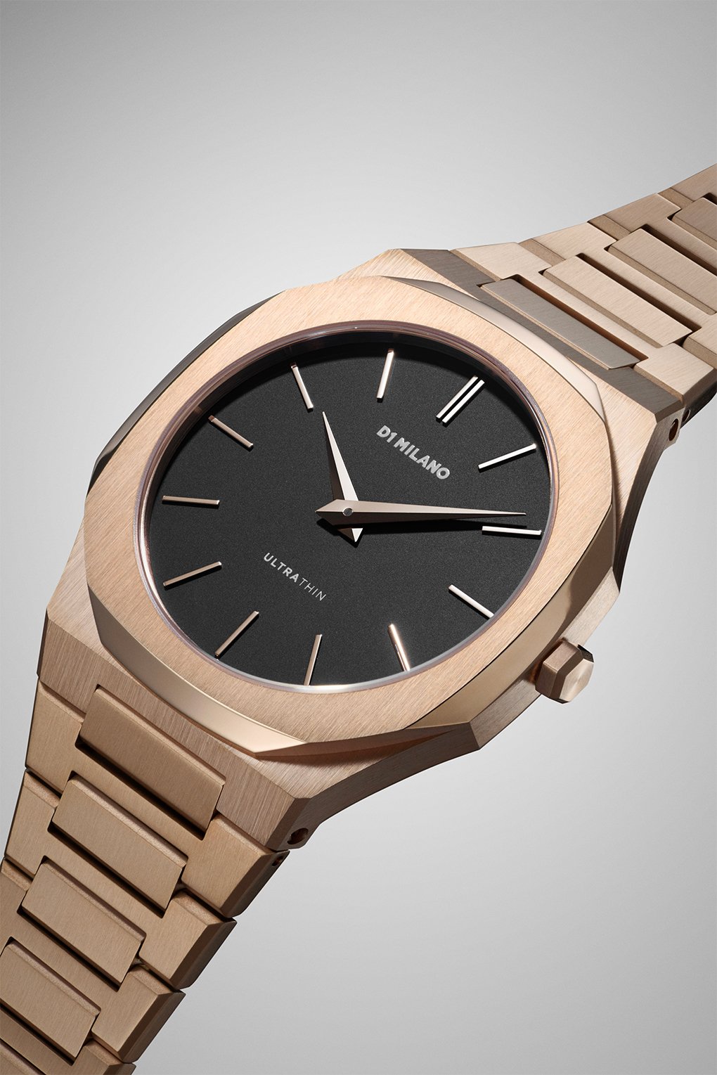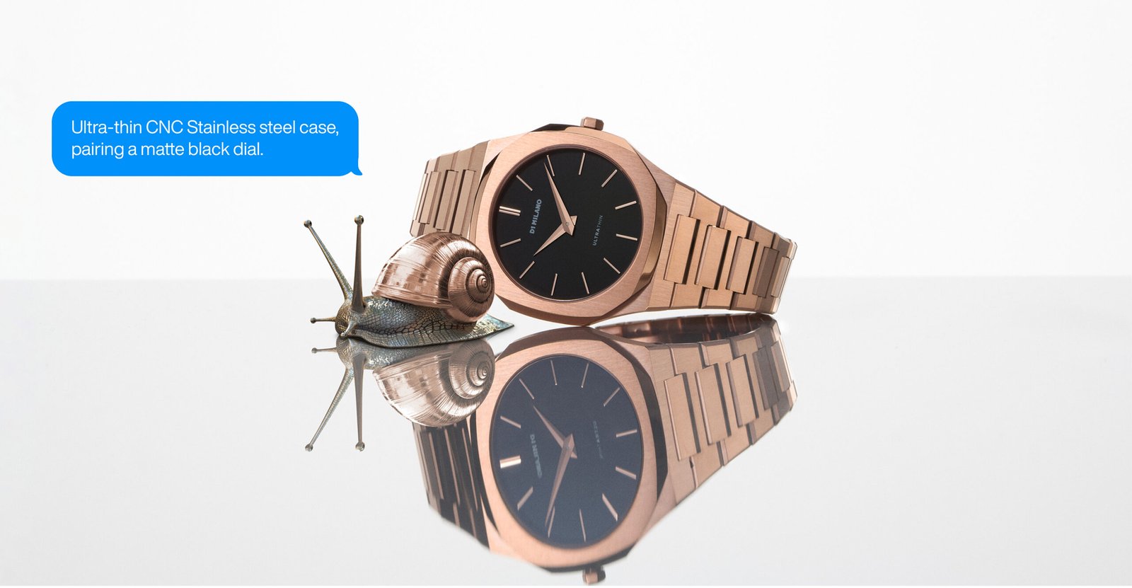 Essential colors contrasted by the black dial from which the details stand out: the logo, hands and hour markers. Every millimeter of this design object has been studied; while maintaining the fundamental feature 6 millimeters thick…this is the NEW ULTRA THIN 40mm