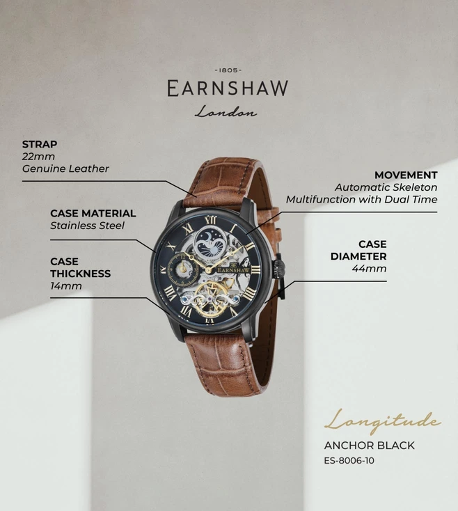 In producing the Meteorite edition of the Longitude multifunction swiss made automatic watch, the EARNSHAW brand continues a journey of producing exceptional pieces that utilize the best in watch making techniques, dressed in the classic traditions of watch design. The Meteorite edition marries the same Longitude case but takes a piece of genuine Muonionalusta meteorite which is painstakingly carved and assembled in Switzerland.