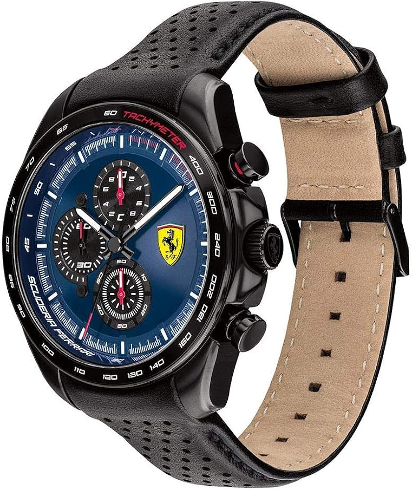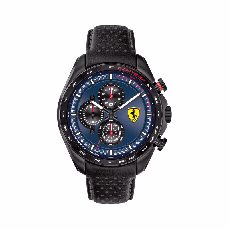 The sleek and stylish Speedracer collection was designed to put the Scuderia Ferrari fan in the driver’s seat. It incorporates classic and contemporary elements from the exciting racing world into a timeless design birthed in the ’70s. The perforations on the genuine leather strap are inspired by classic driving gloves and the contrast red hue on the push button and dial markers are reminiscent of the distinctive red detailing found on the buttons and gauges within the cockpit of the revered cars from Maranello.