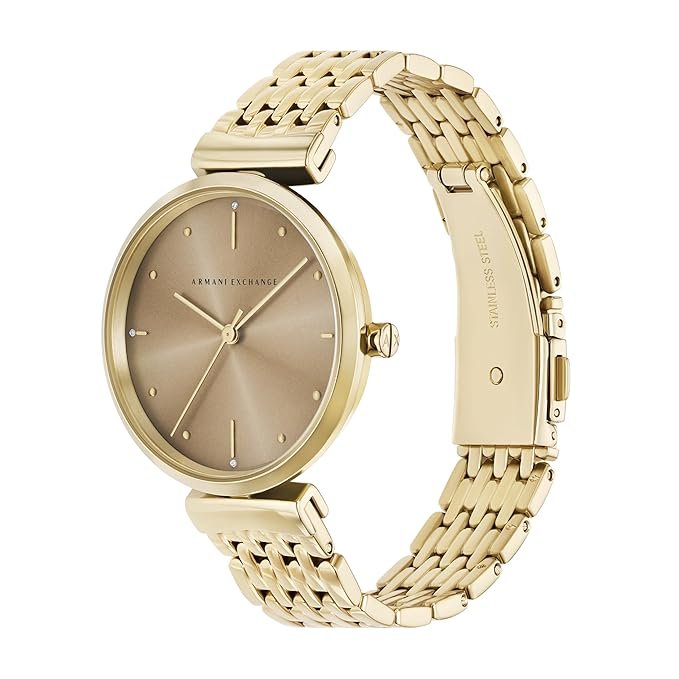Armani Exchange’s 36mm two-tone stainless steel watch features a captivating green sunray dial and an elegant two-hand quartz movement. The combination of rose gold and silver tones on the bracelet adds sophistication, making this timepiece a versatile accessory for any occasion. The durable mineral crystal and classic round case shape complete the design, exuding timeless style and reliable functionality.