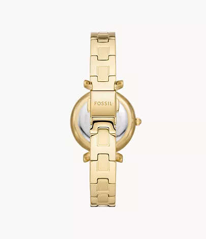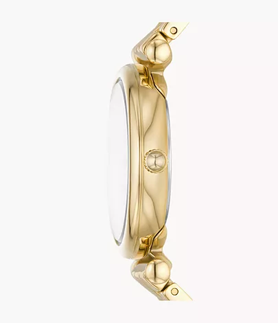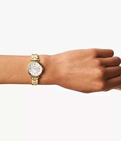 This 28mm Carlie features a silver sunray dial, three-hand movement and gold-tone stainless steel bracelet.