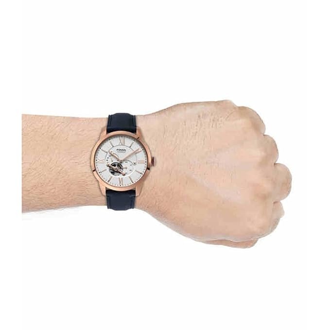 The minute you land your eyes at this men’s automatic multi-function watch from the House of Fossil, you’ll want to own it. This classic Townsman twist watches have the look and feel of an automatic but the timekeeping accuracy of quartz. With a white satin dial, three lum hands and dark blue leather strap, this multi-function watch is battery operated, so winding will never be on the agenda.