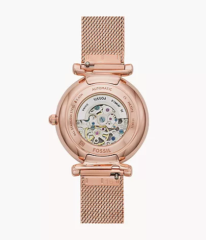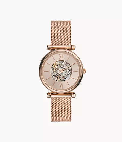 This 35 mm Carlie features a rose gold sunray dial, automatic movement and a rose gold-tone stainless steel mesh bracelet.
