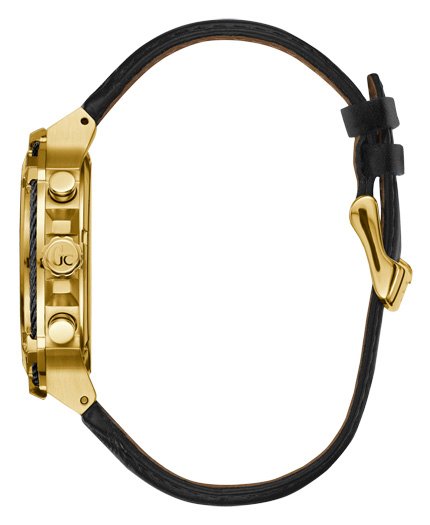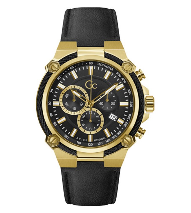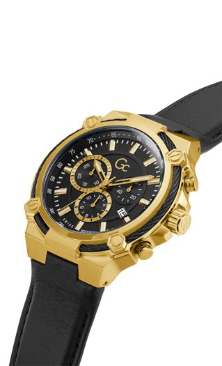 Swiss Mvt – P&B Yellow Gold PVD case – Black PVD cable on bezel – Black dial – Chrono – Black leather strap – Ø 44 mm – Sapphire coated mineral glass
