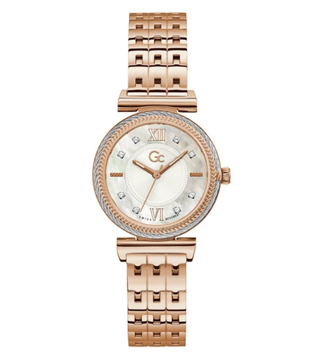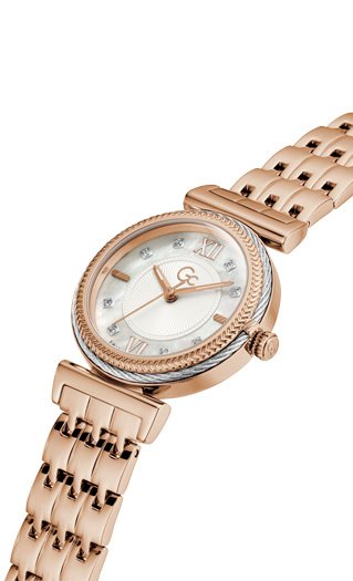 Swiss Mvt – P Silver & Rose Gold PVD case – White MOP dial w/Swarovski crystals – Ø 32 mm – Rose Gold PVD bclt – Sapphire coated mineral glass