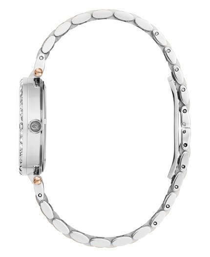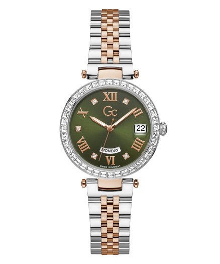 Swiss Mvt – P Silver & Rose Gold PVD case w/crystals & bclt – Green dial – Ø 34mm – Day-Date – Sapphire coated mineral glass