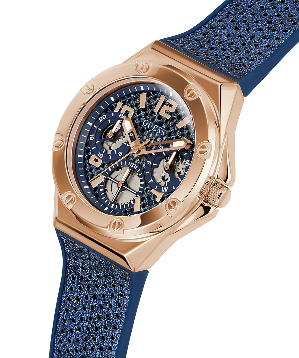 Amaze everyone around you by wearing this women’s analog watch from Guess. The blue round dial is protected by a mineral glass. It features multifunction and a crown for time adjustment. The silicon strap comes in a blue hue that further elevates the look of the timekeeper. Besides, it is completed with a buckle clasp to ensure a secure fit on the wrist.