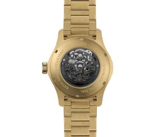 The Round case is 44 mm wide and 14 mm height and, depending on individual taste, will adorn almost any wrist. The bezel, which is Fixed, stands out discreetly from the case. The case back of the watch is a Glas bottom, screwed, which sets the final point for a coherent design.