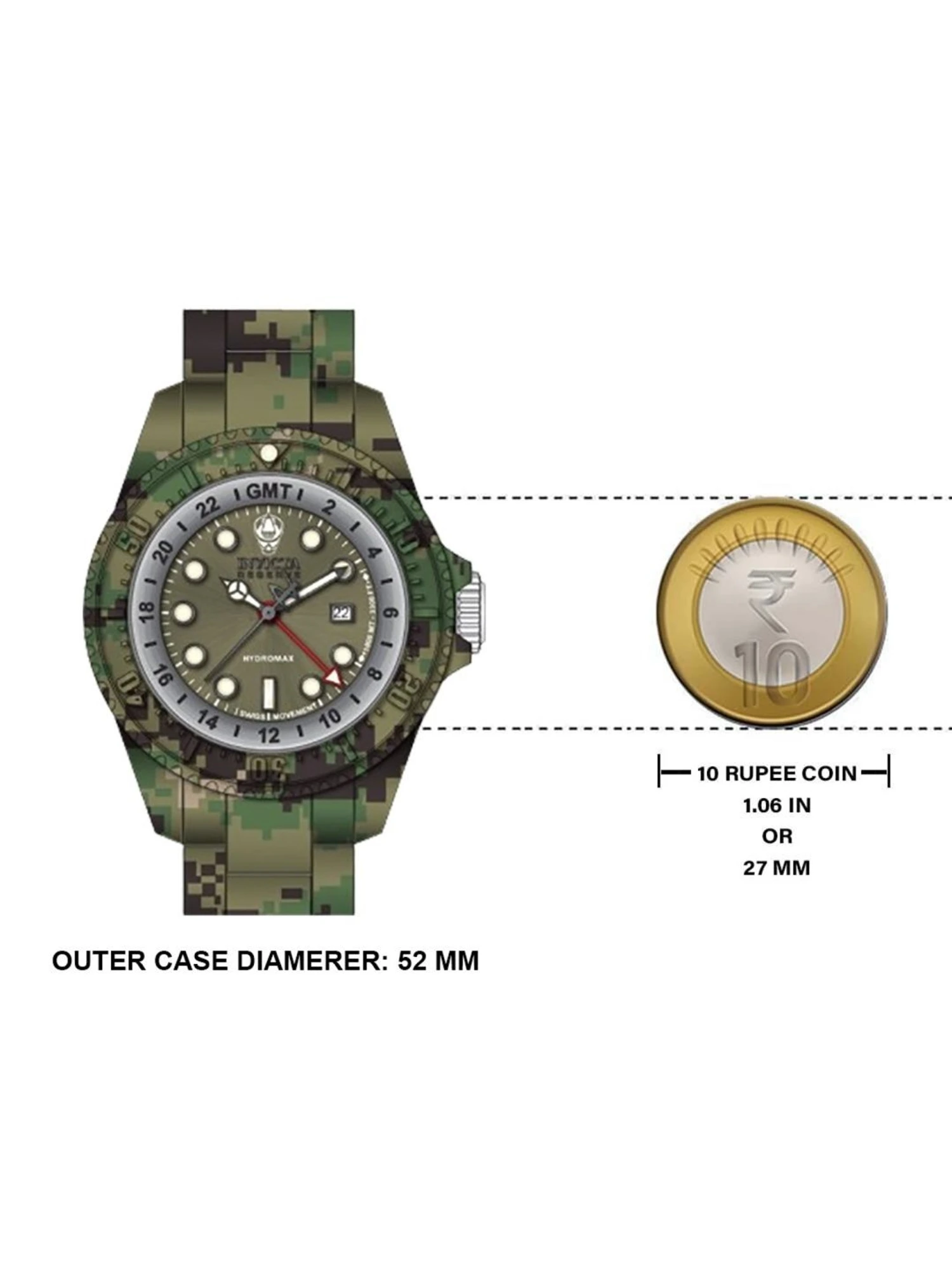 A must-have timepiece for all the watch aficionados, this Men’s Analog watch from INVICTA will be a perfect pick. Its Stainless Steel strap vaunts a Silver hue that enhances the look of the watch. The Green Round dial is protected by a Synthetic Sapphire. It showcases Plain 3-Hand and a crown for time adjustment. Furthermore, it is complemented with a Fold-Over Push Button Clasp with Safety clasp that ensures a secure fit on the wrist.