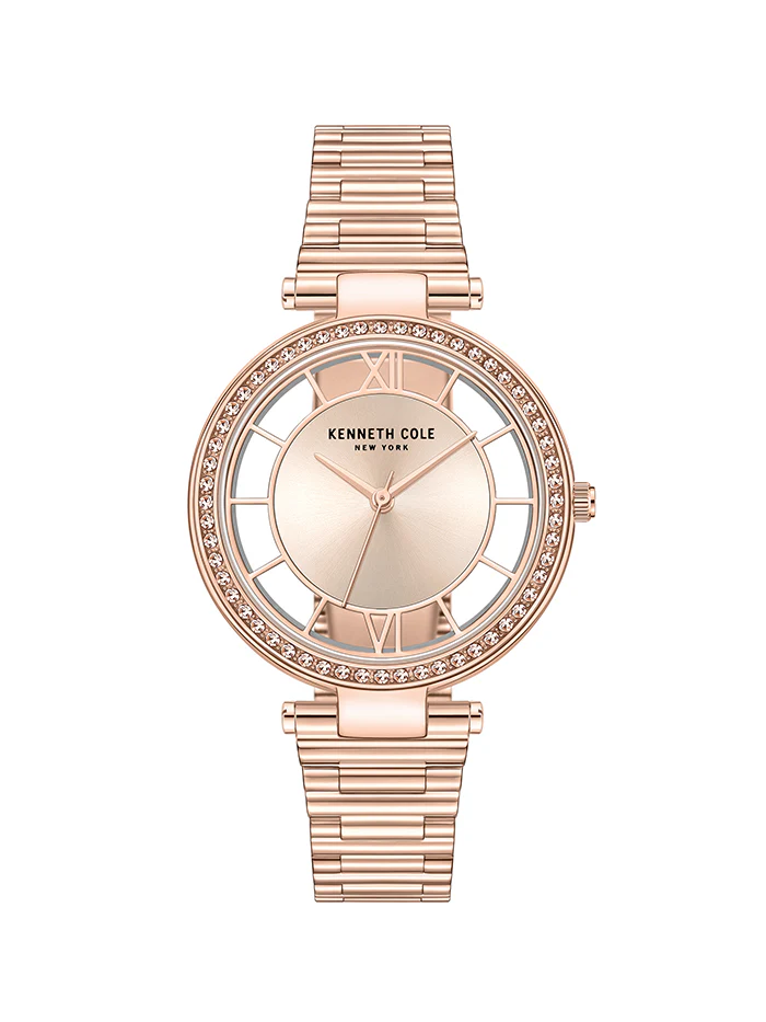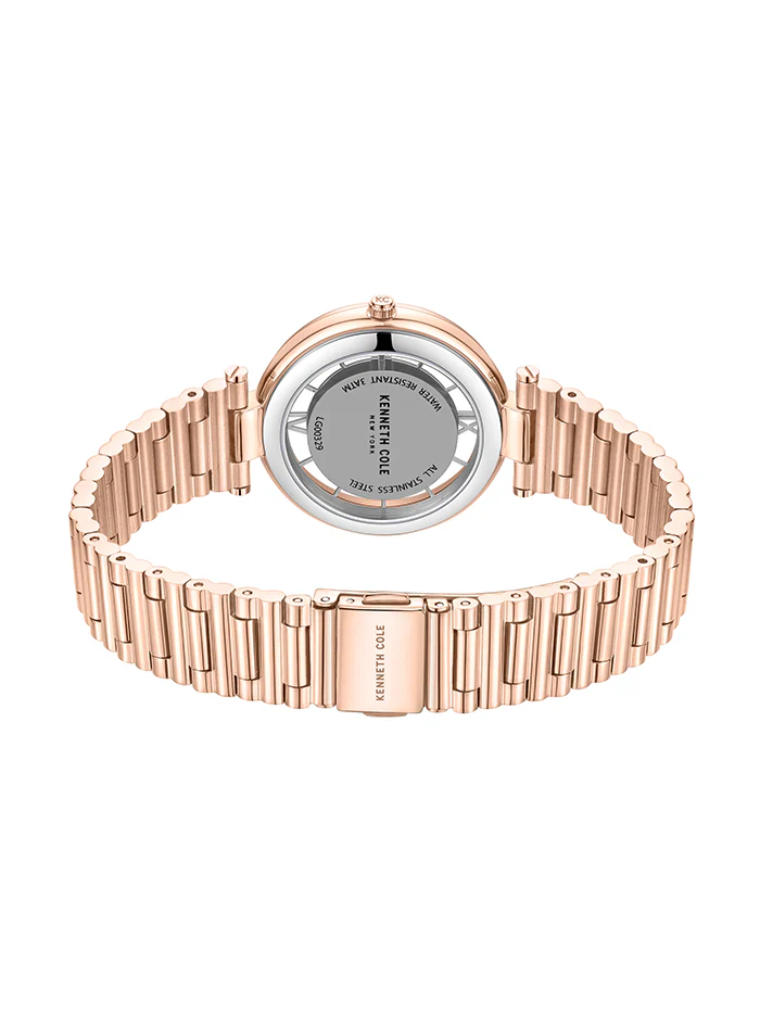 The Kenneth Cole New York 3-hand watch ensures precise timekeeping, while the light rose gold dial and dome glass create a subtle and refined appeal. The semi-transparent display is elevated with a bezel that is beautifully accented with delicate peach stones, adding a touch of femininity and sophistication.
