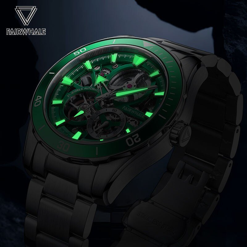 This exquisite timepiece is a testament to refined craftsmanship and modern elegance. The watch features a vibrant green bezel, harmoniously paired with a skeletonized dial that reveals the intricate mechanics beneath. Its polished stainless steel case and bracelet add a touch of sophistication, while luminous markers ensure clarity and function in any light. The exposed gears and precision movements symbolize the marriage of art and engineering, making it a bold statement for those who appreciate timeless style and technical mastery. Perfect for the connoisseur of luxury and innovation.