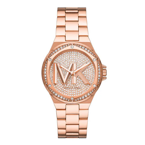 Be up-to-date with the latest styling by wearing this women’s analog watch from Michael Kors. The rose gold round dial is protected by a mineral glass. The Michael Kors logo takes center stage in a bold faceted form on this 37mm Lennox with a full pave dial. This rose gold-tone watch features a uniquely faceted pave topring, and is sure to be a show-stopper. Besides, it is completed with a fold-over clasp with double push button safety clasp to ensure a secure fit on the wrist.