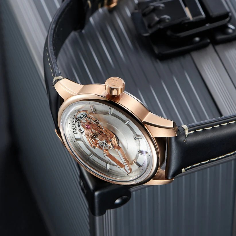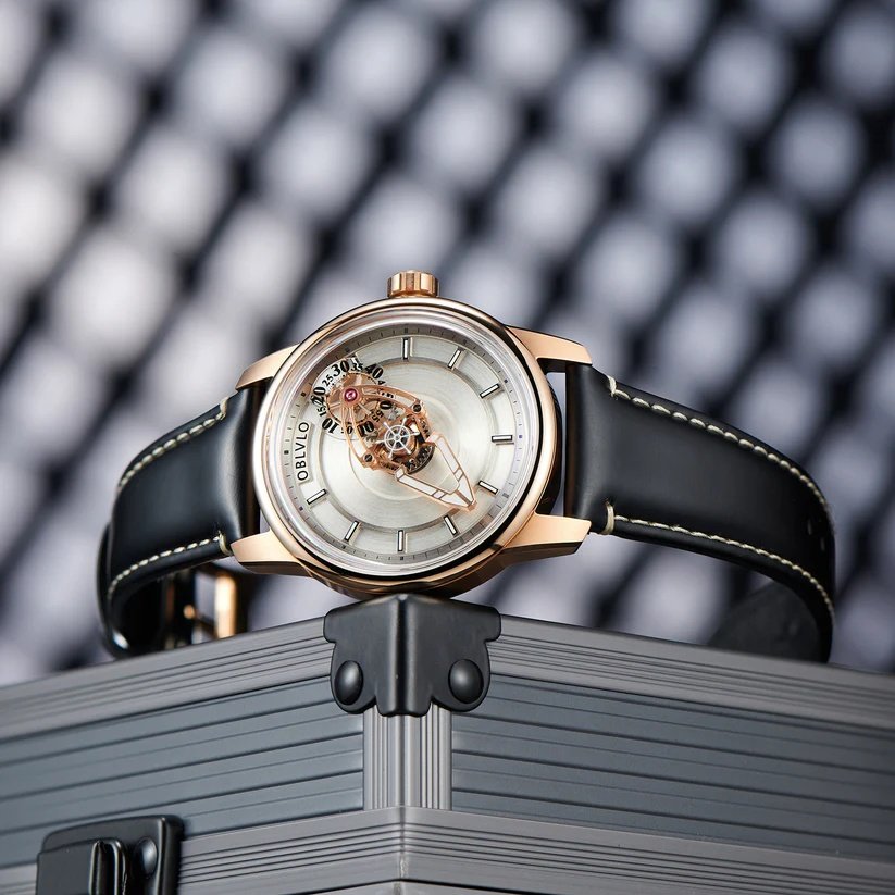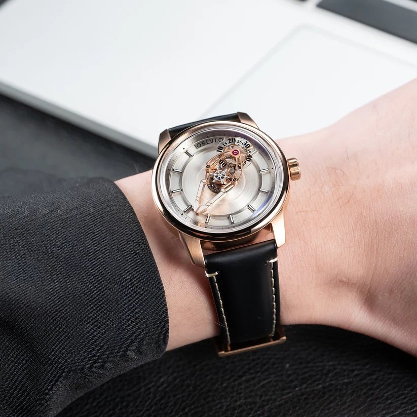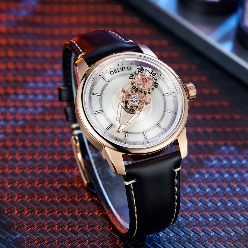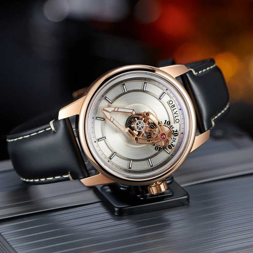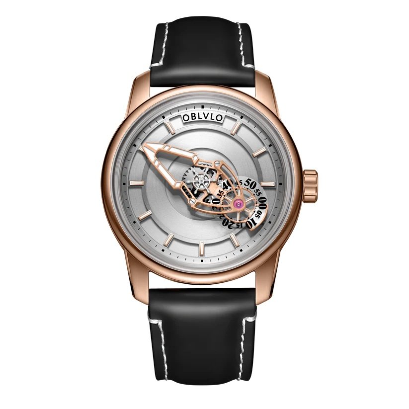 | This exquisite timepiece from OBLVLO showcases a modern and sophisticated design that effortlessly merges elegance with mechanical precision. The watch features a striking rose gold case that complements its minimalist silver dial, adorned with subtle hour markers. Its standout element is the intricately skeletonized hands, revealing the intricate inner mechanics beneath. A unique rotating disc replaces the traditional seconds hand, adding a contemporary and technical flair to its design. The visible gear and ruby jewel at the center enhance its mechanical charm, offering a glimpse into its complex movement. Paired with a classic black leather strap with white stitching, it achieves a perfect balance of luxury and timeless style. The craftsmanship highlights fine detailing, visible in the precision of the hands and the bold crown design. The watch is ideal for those who appreciate avant-garde horology combined with traditional elements. This model makes a statement of refinement, innovation, and passion for the art of watchmaking. |