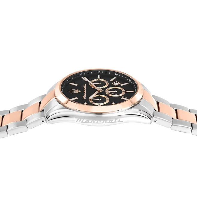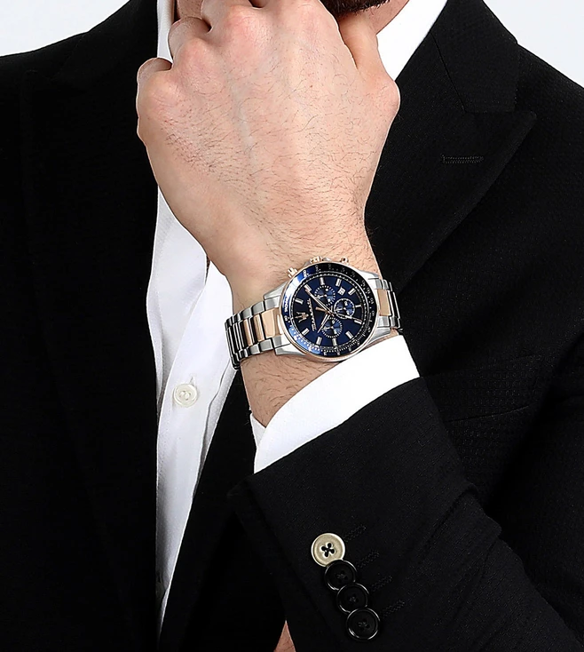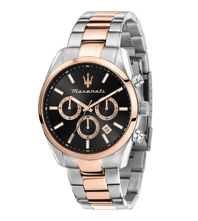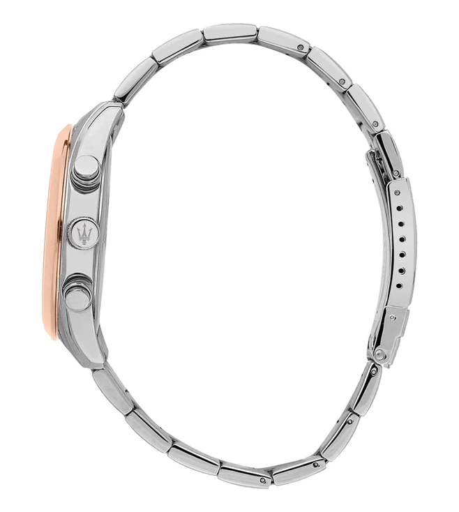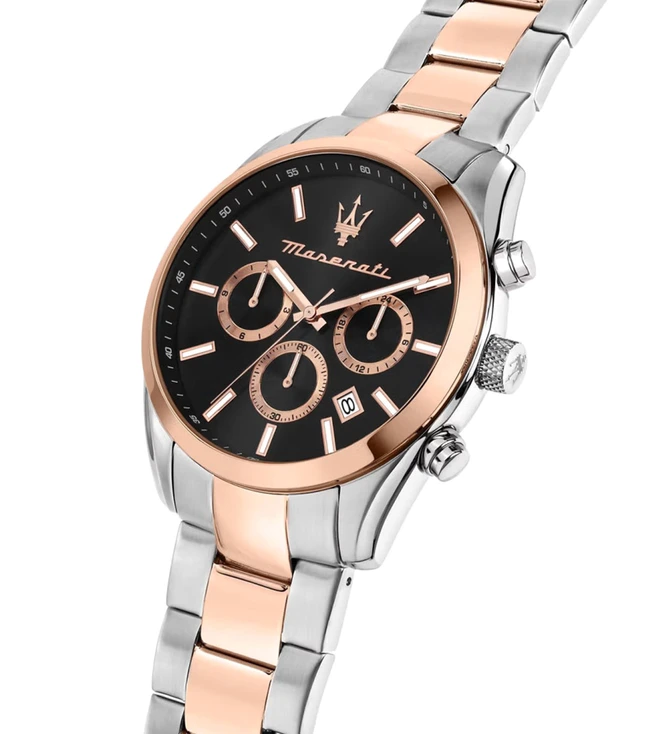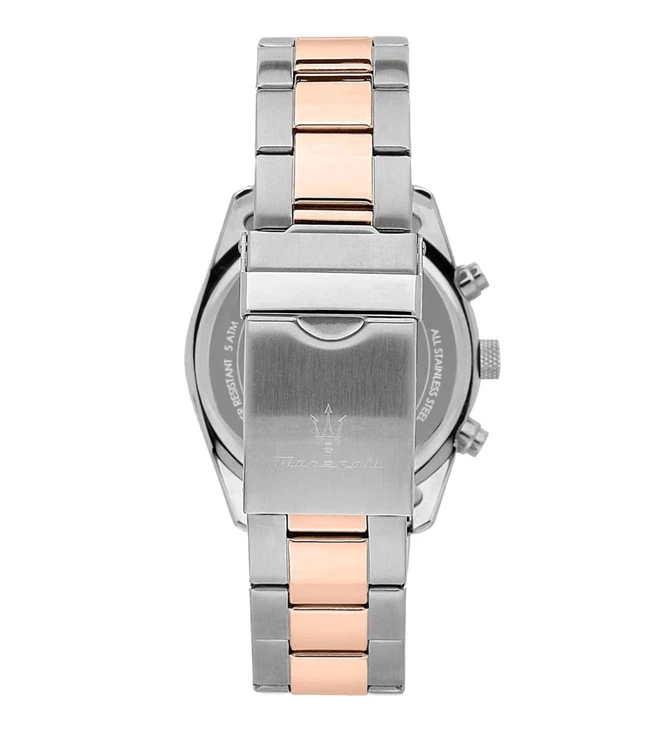 Add a stylish dimension to your look by wearing this watch from the Attrazione collection by Maserati. Covered by crystal mineral glass, the round-shaped dial is nestled in a 43 mm case. The watch works on a quartz movement and is water resistant up to 50 m. Moreover, it is fitted with a deployment clasp.