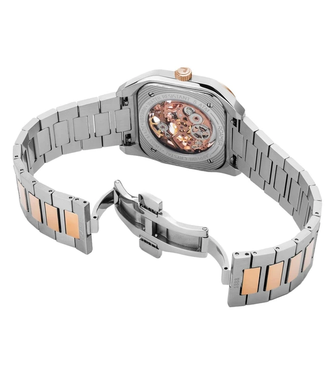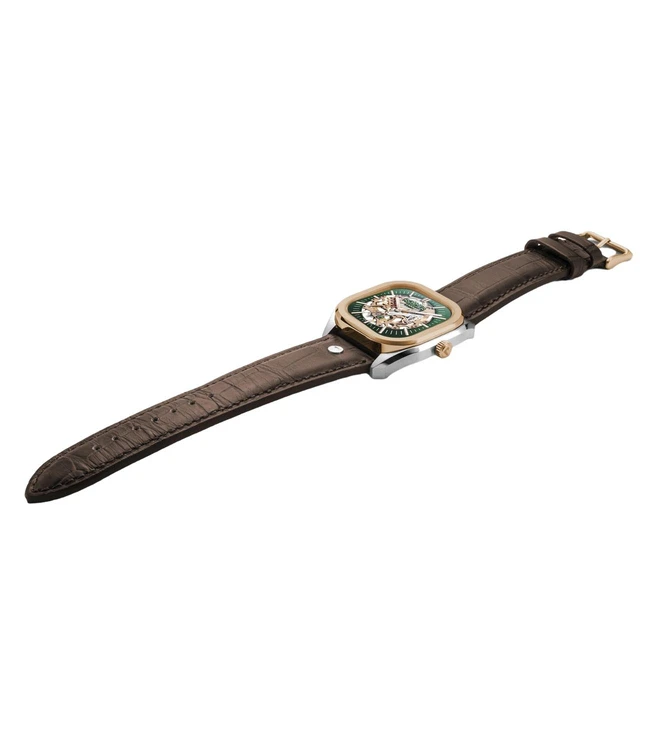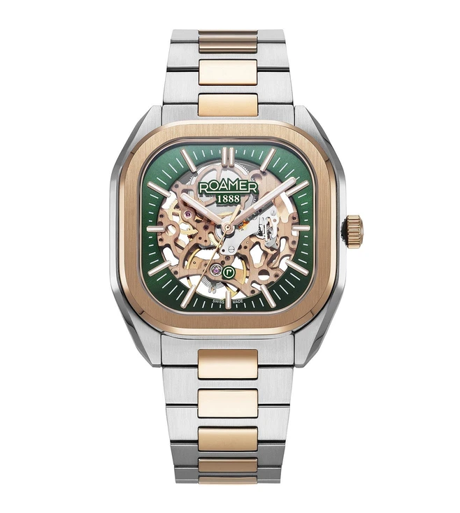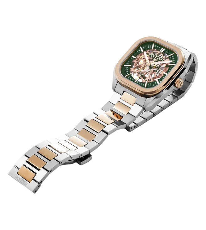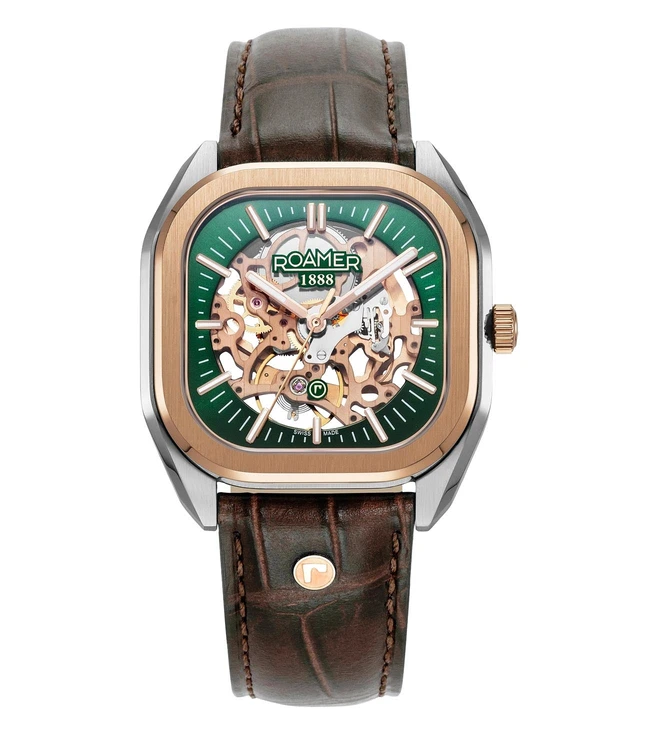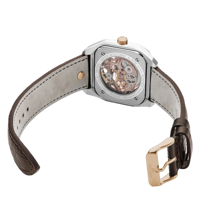 The ROAMER OF SWITZERLAND MST is a striking new addition for watch enthusiasts, featuring a manual winding mechanism that celebrates the ritual of hand-winding. This Swiss Made men’s watch combines high-class functionality with a vintage-inspired design. Its sophisticated square case with rounded corners includes a round skeleton window showcasing the mechanical MST-23 movement by Meyer and Studel. The MST comes in an interchangeable box set with double straps in crocodile-style embossed leather – black, blue, or brown – and an easy-change push-pin system, allowing for effortless style updates
