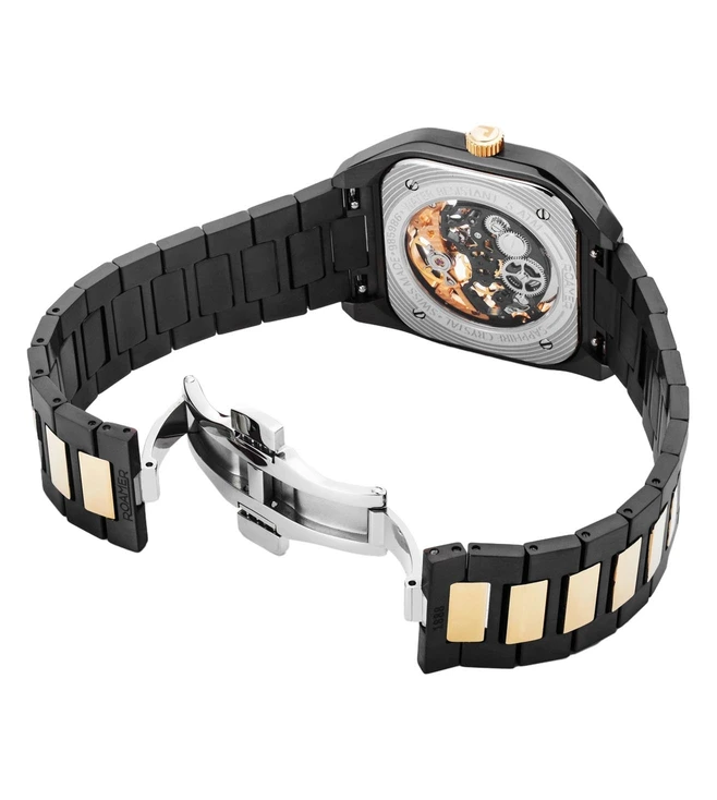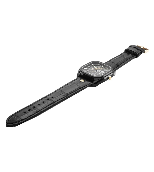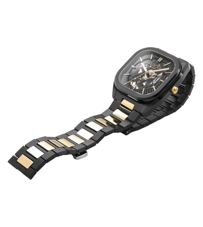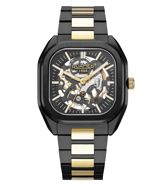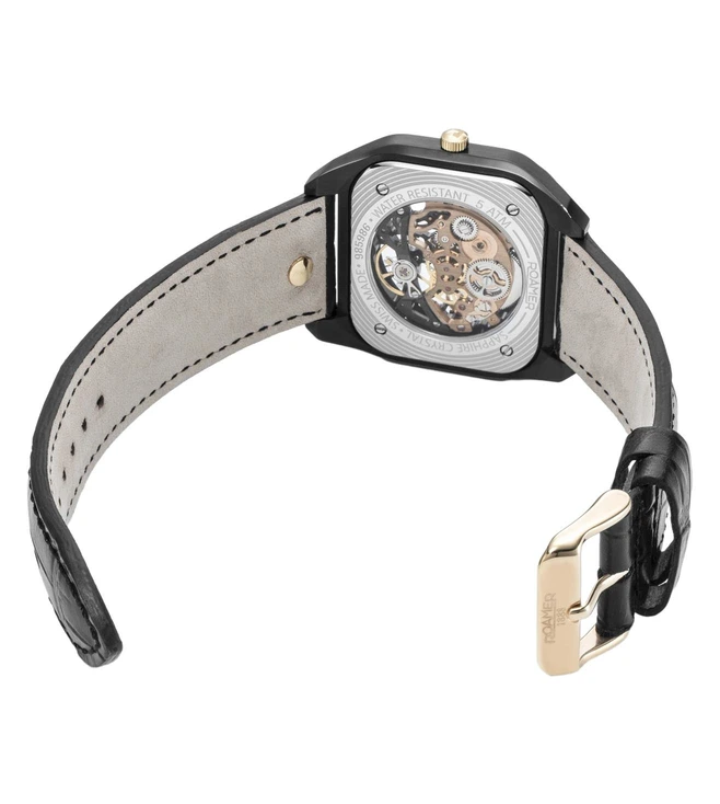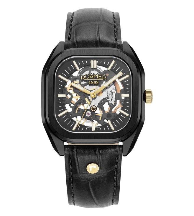 The ROAMER OF SWITZERLAND MST is a striking new addition for watch enthusiasts, featuring a manual winding mechanism that celebrates the ritual of hand-winding. This Swiss Made men’s watch combines high-class functionality with a vintage-inspired design. Its sophisticated square case with rounded corners includes a round skeleton window showcasing the mechanical MST-23 movement by Meyer and Studel. The MST comes in an interchangeable box set with double straps in crocodile-style embossed leather – black, blue, or brown – and an easy-change push-pin system, allowing for effortless style updates