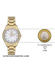 Amaze everyone around you by wearing this women’s analog watch from Santa Barbara Polo & Racquet Club. The white round dial is protected by a mineral glass. The stainless steel strap comes in a yellow hue that further elevates the look of the timekeeper. Besides, it is completed with a fold-over push button clasp with safety clasp to ensure a secure fit on the wrist.