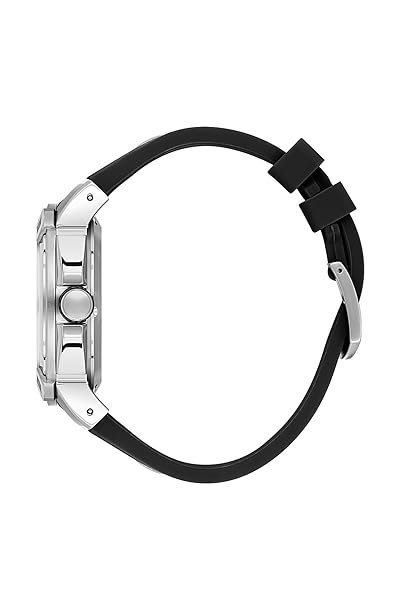Add a classy touch to your attire by wearing this men’s analog watch from the collection by Santa Barbara Polo & Racquet Club. The silver round dial is protected by a mineral glass. It features crown for time adjustment. The rubber strap flaunts a black hue that accentuates the look of the watch. Besides, it is completed with a buckle clasp to ensure a secure fit on the wrist.