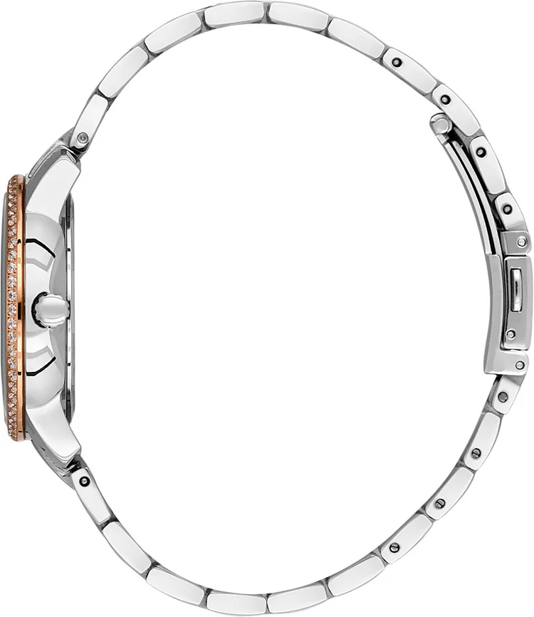Quartz wristwatch for women. Round steel case with polished finish. Guilloche dial decorated with the brand logo. Applied markers in the form of Roman numeral XII and dots with crystals.Blue rectangular hands in Baton style. Day/night indicator. Fluted winding crown. Reliable steel bracelet with polished finish. Folding clasp.