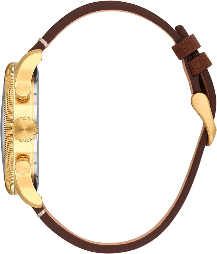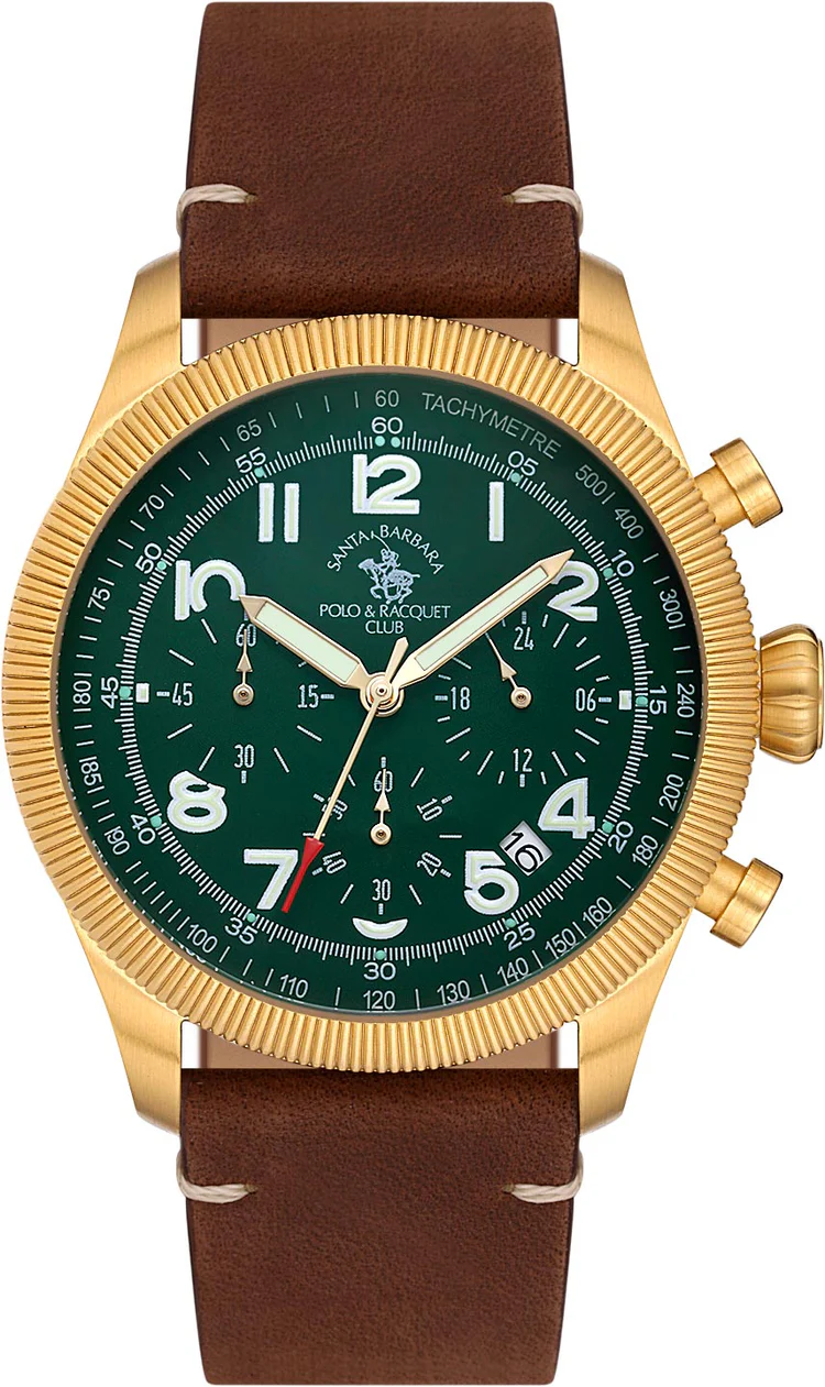 Multifunctional men’s chronograph watch with stopwatch and tachymeter. Steel case with matte finish. Decorative fluted bezel.12 and 24 hour formattime. The date window is located between the 4 and 5 o’clock positions. The matte dial is decorated with the brand logo.Arabic numeral markers. Pointed rectangular Baton-style hands. Hands and markers with a luminescent coating that glows in the dark after a short charge in the light. Conical crown. Comfortable leather strap with a classic clasp.