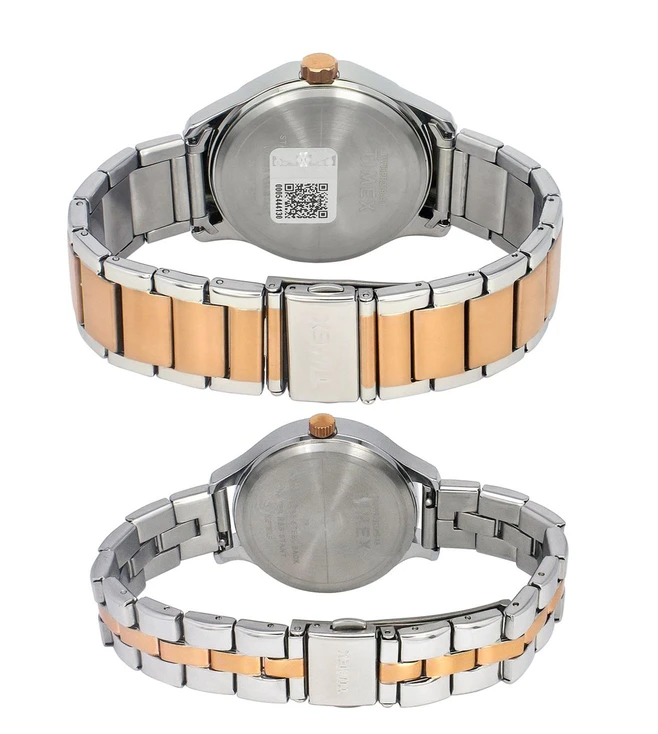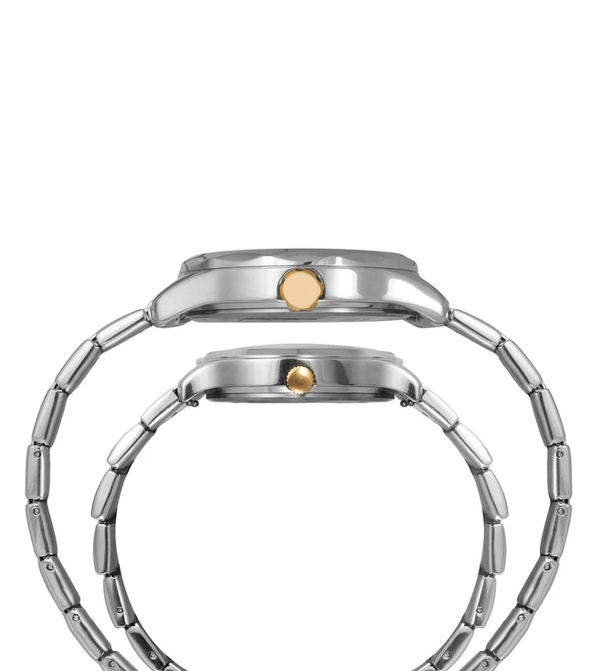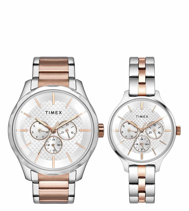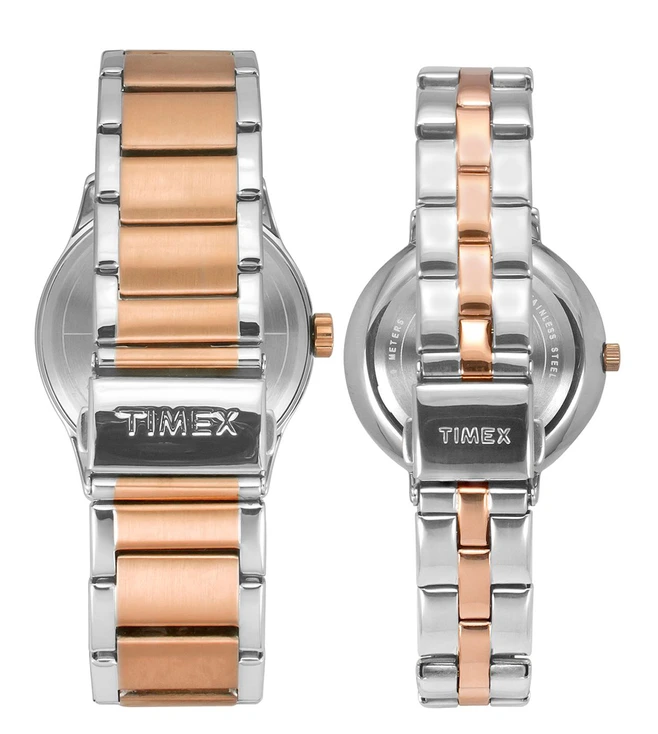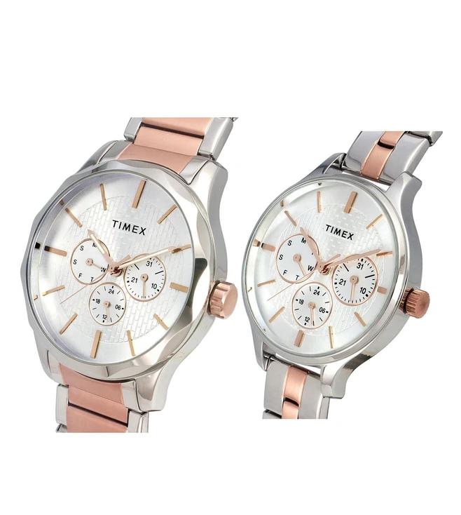 Gift the perfect keepsake this wedding season with the pair of Timex Fashion collection multifunction watches. Functional on a quartz movement a dual finish dial accentuates the look of the watch. With a charming stainless steel bracelet, these sleek and modern timepieces are meticulously designed to provide a perfect fit.