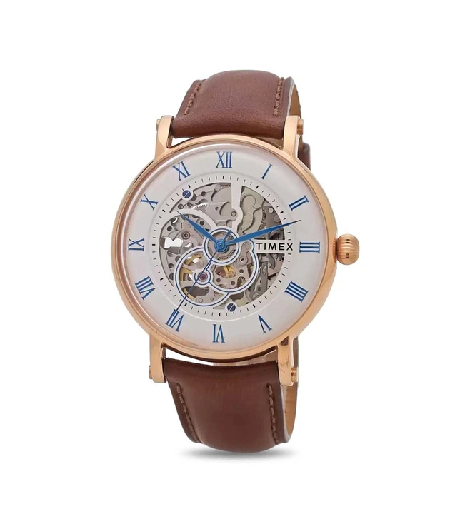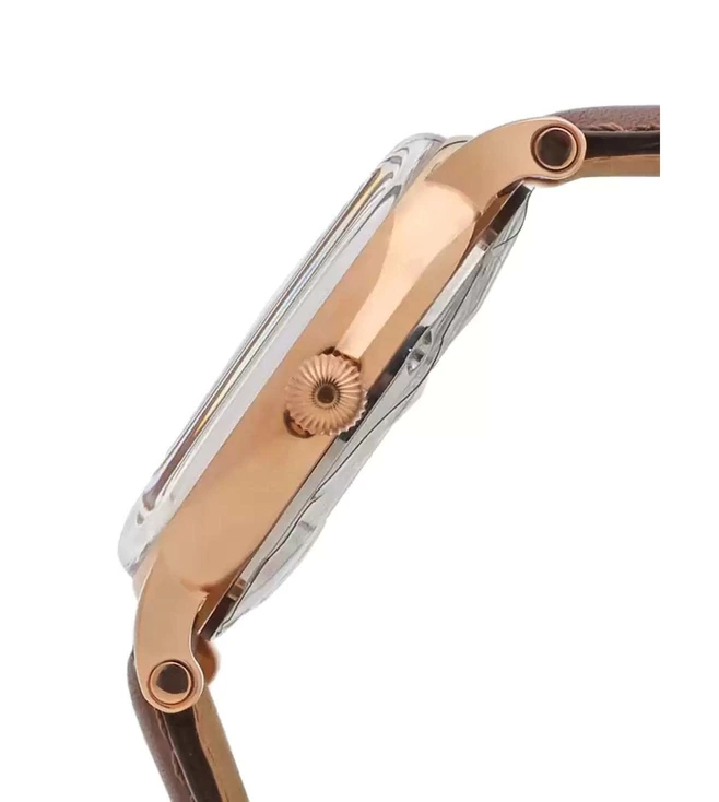 Exuding modern-day styling, this analog watch from Timex is specially made to exhibit masculine charm. The silver round dial displays inner workings, plain three hands, Roman numeral hour markings at five-minute intervals and a crown for time adjustment. The genuine leather strap exudes a brown hue that accentuates the look of the watch. Besides, it is finished with a buckle clasp that provides a secure fit on the wrist.
