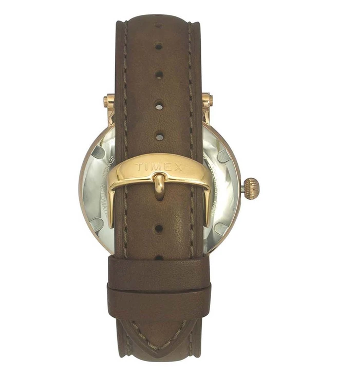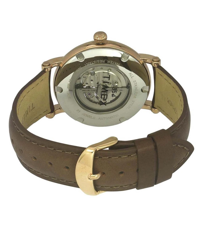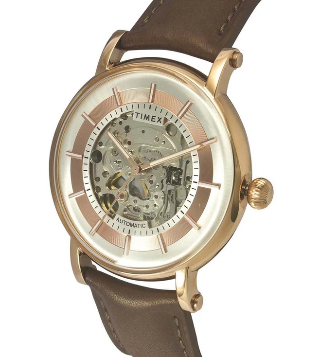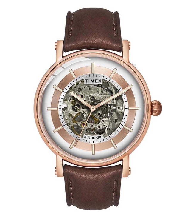 Enrich your watch collection with this full-skeleton automatic watch from Timex that comes with a silver dial and a sapphire nano-coated domed crystal. Its brown Italian leather strap further accentuates its design.