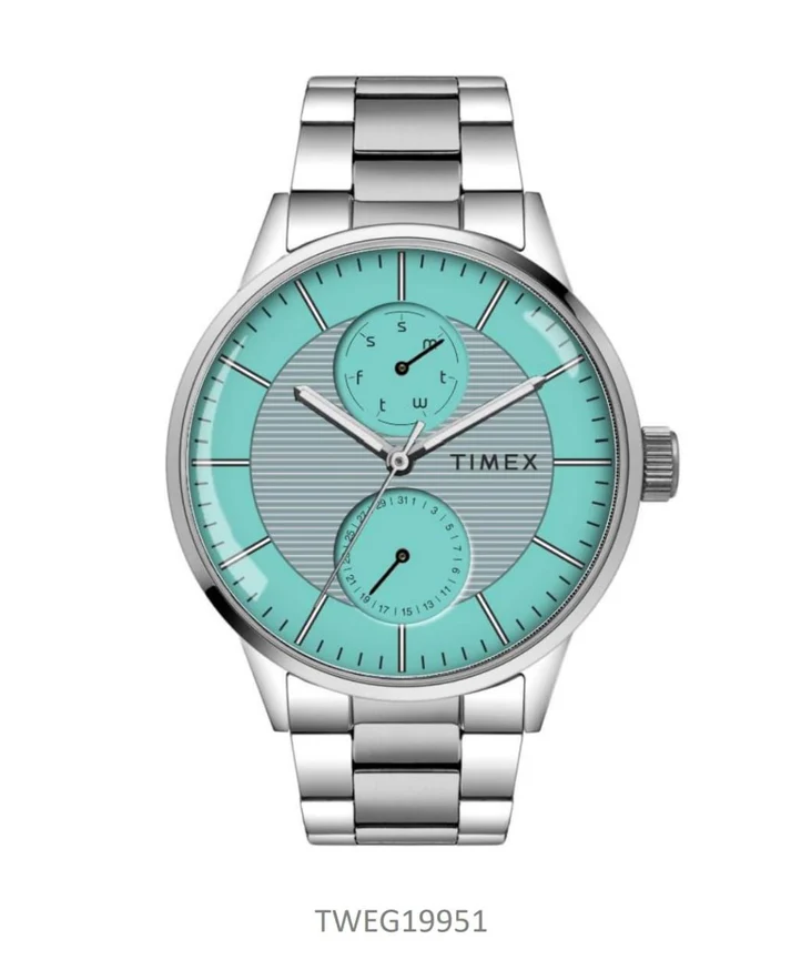 The Timex TWEG19951 men’s watch features a stunning Tiffany blue round dial that brings a fresh pop of color to your wrist. Encased in a sleek stainless steel case with a polished finish, it offers a perfect blend of style and sophistication. The watch is powered by reliable quartz movement and is complemented by a comfortable silver-tone bracelet, making it a versatile accessory suitable for any occasion. Ideal for those who appreciate a modern and vibrant timepiece