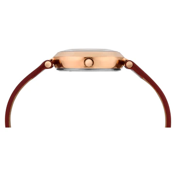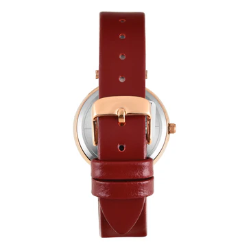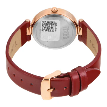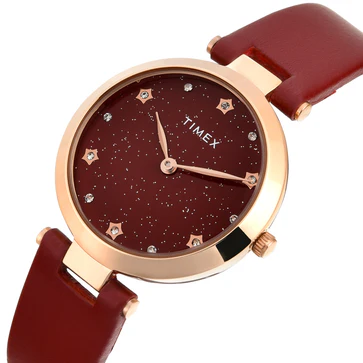 Merging contemporary style with performance, this women’s analog watch by Timex will lend you a modish look. The red round dial is secured by a mineral glass and is encased in a 32.6 mm case. It exudes plain two hands. The leather strap exudes a red hue that accentuates the look of the watch. Furthermore, it is completed with a buckle clasp to ensure a secure fit on the wrist.