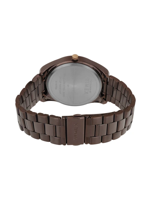 Elicit amazement by wearing this men’s analog watch from Timex. Encased in a 43 mm case, the brown round dial features plain 3-hand functionality with a quartz movement. The stainless steel bracelet comes in a brown hue that further elevates the look of the watch. Besides, it has water resistance up to 30m and a push button clasp to ensure a secure fit on your wrists.
