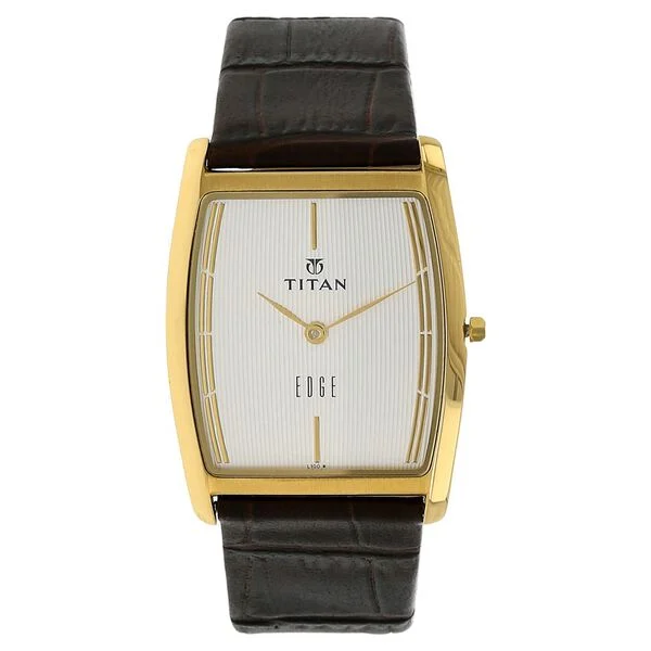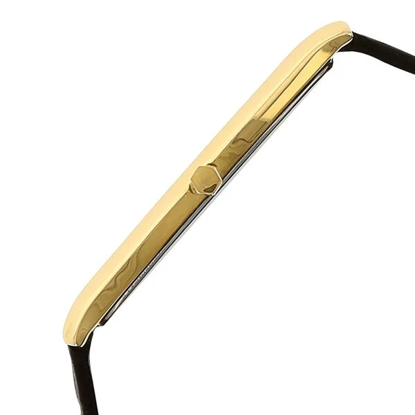 This analog watch for men features a white dial with two plain hands and slanted markings at the five minute intervals, enclosed in a gold case that has a crown. Made of leather, its brown strap is fitted with a buckle closure for a comfortable fit.