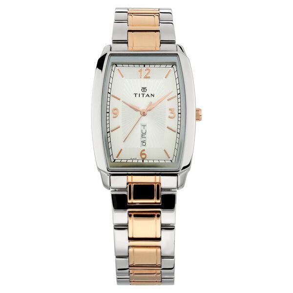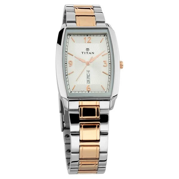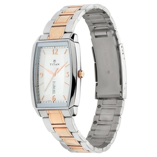 Look outstanding by sporting this men’s analog watch from the Karishma collection by Titan. Its tonneau-shaped white dial is protected in a case of 45.3 mm size. The stainless steel bracelet of this watch exudes a rose gold hue for an eye-catching look. Its fold-over clasp ensures a secured grip around the wrist. The inclusion of plain 3-hand quartz movement adds to its features.