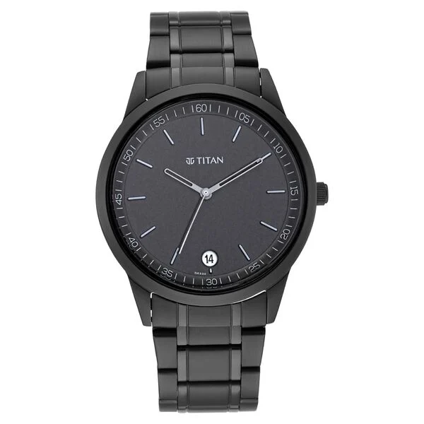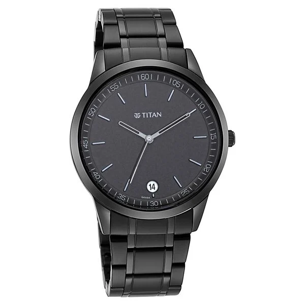Sporting the right amount of soberness, this men’s analog watch from the Minimals collection by Titan is a must-have wrist essential. Functional on a quartz movement and protected by a mineral glass, the black round dial is housed in a 42 mm case. It displays plain three hands and a crown for time adjustment. The metal strap showcases a black hue that uplifts the look of the timepiece. Besides, it is completed with a push-button clasp to ensure a secure fit on the wrist.