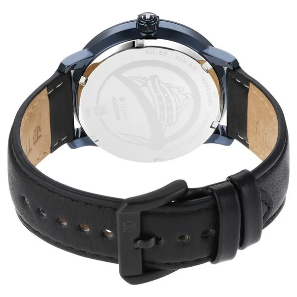 Dive into the depths with the bow watch from Titan Maritime, a collection inspired by seafarers and their adventorous voyages. This watch is inspired by the dynamic bow of ocean liners showcased through textured black dial detailing, anchor inspired indices and uniqe bow-shaped hands. The dual toned silver dial is complimented with black leather straps making it a perfect peice for work. Pair this with your suits and elevate the conversation in the room.