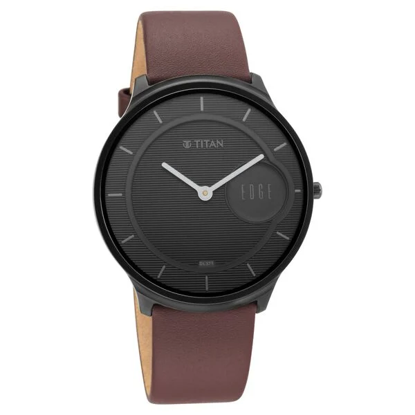Give a modish look to your wrist by donning this men’s watch from the Edge Baseline collection by Titan. Secured by a sapphire glass, the black round dial is operational on a quartz movement. It exhibits plain two hands and a crown for time adjustment. The genuine leather strap exudes a brown hue that accentuates the look of the watch. Moreover, it is equipped with a buckle clasp to ensure a secure fit on the wrist.