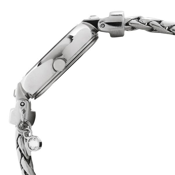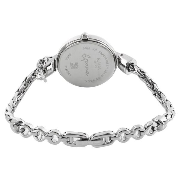 Inspired by Spanish folklore, this exclusive timepiece for women by Titan Raga Espana is an example of true craftsmanship. The silver white dial studded with crystals on its bezel and the weaved chain strap makes it a perfect substitute for a jewellery. Hands of this analog style watch showing quartz movement, it is upto 3 ATM water resistant.