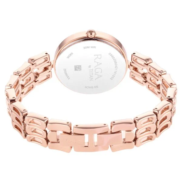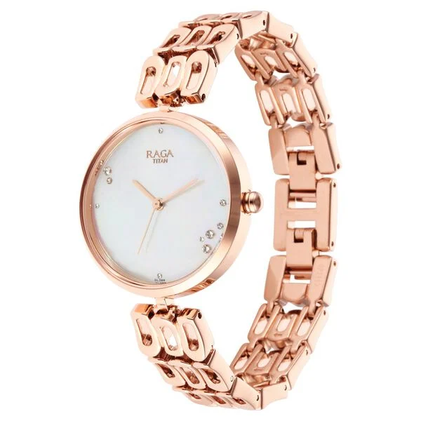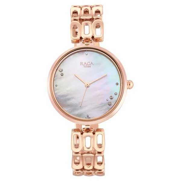 Effortlessly combining style and functionality, this women’s analog watch from the Raga Chic collection by Titan will be a perfect pick. The stainless steel strap showcases a rose gold hue that uplifts the look of the watch. Functional on a quartz movement, the mother of pearl round dial is encompassed in a sturdy case. It features plain three hands and a crown for time adjustment. Furthermore, it is complemented with a jewellery clasp that ensures a secure fit on the wrist.