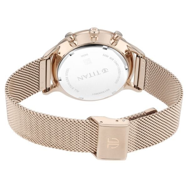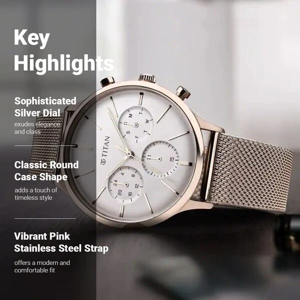 A classy look in a contemporary frame is what perfectly defines this men’s analog watch from the Light Leathers IV collection by Titan. Its stainless steel strap exudes a carnation gold hue that elevates the look of the watch. Housed in a 42 mm case, the silver round dial is protected by a mineral glass. It showcases multifunction functionality and a crown for time adjustment. Furthermore, it is complemented with a hook buckle clasp that ensures a secure fit on the wrist.