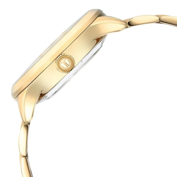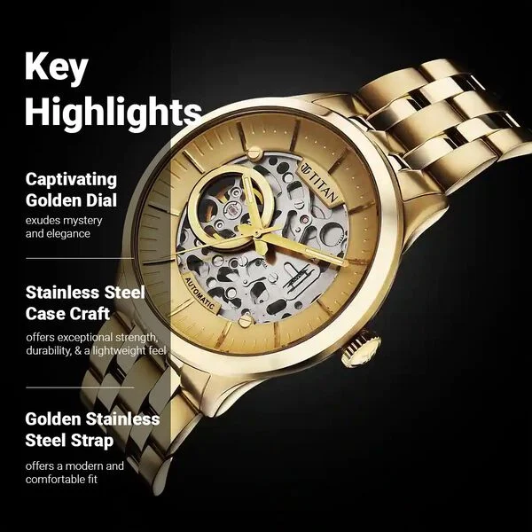Featuring a golden round dial, this men’s analog watch from the Automatics collection by Titan is sure to catch your attention. Enclosed in an elegant case, the dial looks absolutely stunning. It exudes plain three hands and a crown for time adjustment. The stainless steel bracelet comes in a golden hue that further elevates the look of the watch.