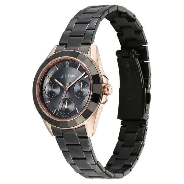 Designed to suit the preference of urban women, this watch from the collection by Titan is sure to make a style statement. Secured by a sapphire glass, the black round dial is protected in a case. It exhibits crown for time adjustment. The stainless steel strap flaunts a gun metal hue that accentuates the look of the watch. Moreover, it is fitted with a fold-over clasp with double push button safety clasp to ensure a secure fit on the wrist.