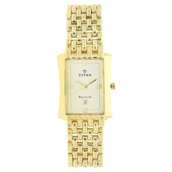 This analog watch for men has a rectangular, white dial that features three plain hands, markings at the quarter intervals and a date display at the 6th hour interval. The dial is enclosed in a gold case that has a crown. Made of stainless steel, its gold strap is fitted with a push button clasp.