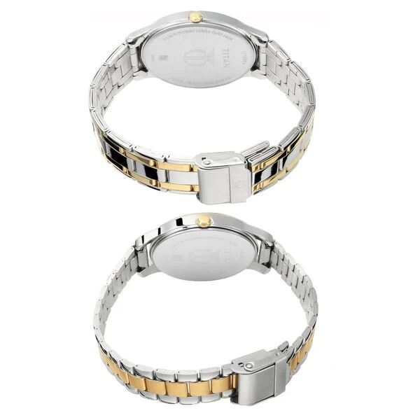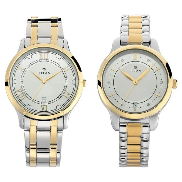 Just like your enduring wedding vows, this Bandhan silver white dial stainless steel couples watch is a testament to eternal commitment. The bi-metal gold color accents and date function add a touch of sophistication and practicality. With its sleek design and two-tone strap, this watch is perfect for any occasion, from weddings to family functions. Pair it with traditional attire for a harmonious and elegant look that reflects your shared love and unity. A perfect wedding gift for couples, this watch set is designed to celebrate your love story and the timeless bond you share.