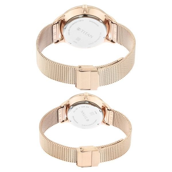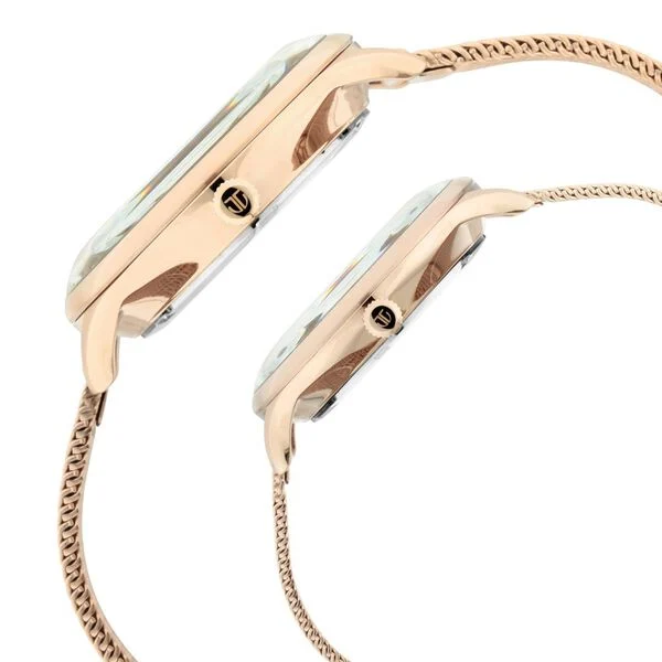 Experience the best things in pairs with this enchanting set of two watches from the Bandhan Collection. Featuring cambered dials with domed mineral glass, these timepieces are beautifully enhanced by carnation gold-plated mesh straps, creating an elegant and sophisticated look. Whether you’re attending a special occasion or enjoying a casual day out, these watches elevate your everyday style with their timeless design. Pair them with coordinated outfits for a cohesive and polished appearance, making this matching set an ideal choice for couples seeking stylish and meaningful wedding accessories or a thoughtful wedding gift.